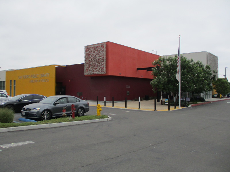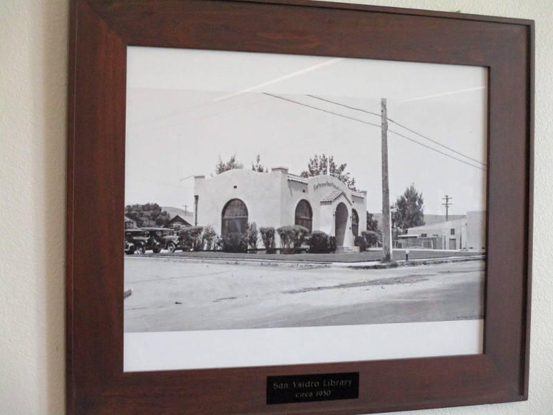 Five years ago the San Ysidro Library moved to its much larger, modern building on Beyer Boulevard. I’ve posted photos in the past, here and here, that show art inside and outside the beautiful new library.