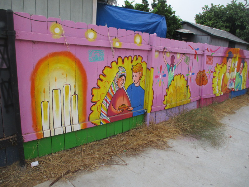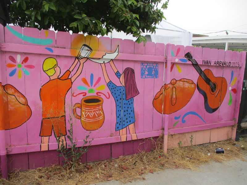 My first images today show a happy mural on a wooden fence at the north end of the corridor. It was painted in 2023. The artist is Ivan Arevalo.