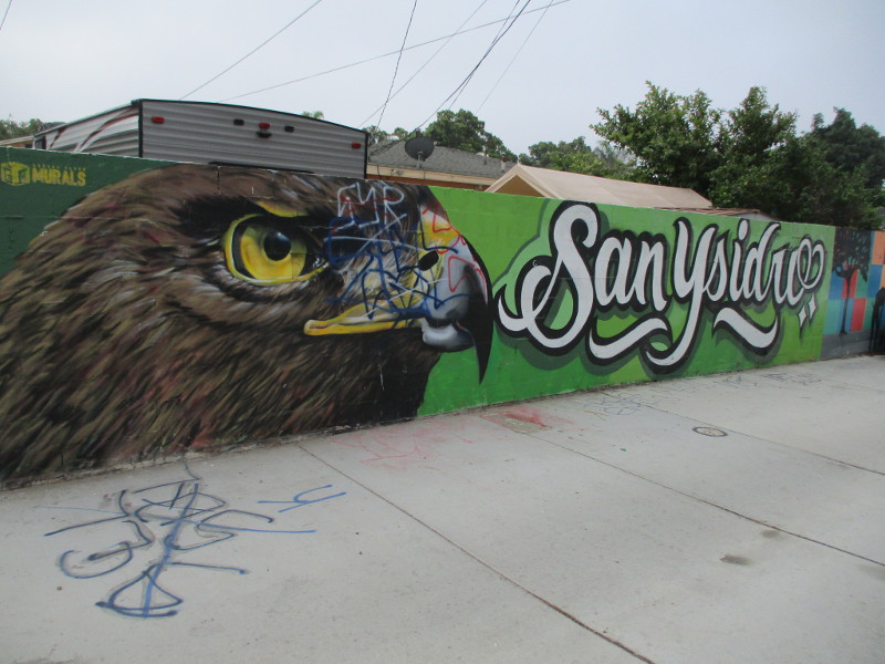 The second mural celebrates San Ysidro. It was painted by Ground Floor Murals. Sadly, you can see how the image of a proud bird of prey has been defaced by a tagger.