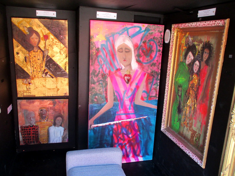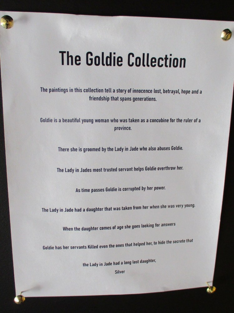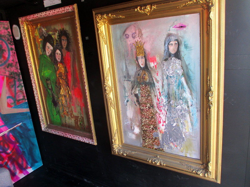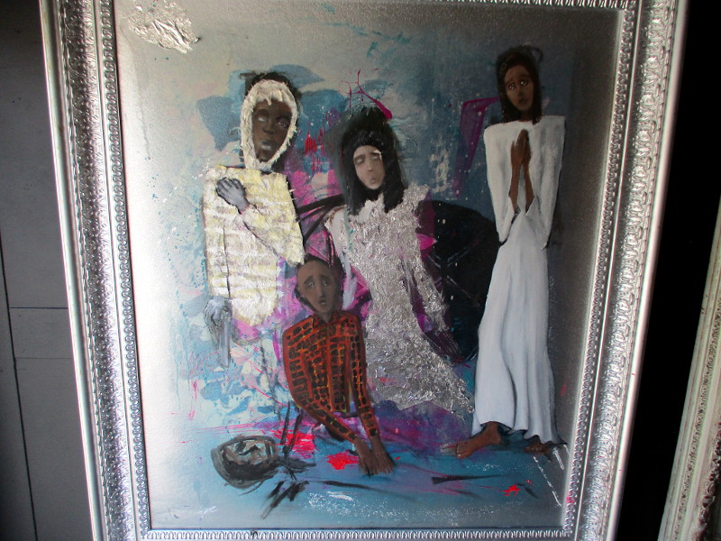 Check out some photographs of his shining mixed media artwork. As a sign explained: The paintings in this collection tell a story of innocence lost, betrayal, hope and a friendship that spans generations… While the story and images might appear a bit exotic, the themes are universally human. Cool art, right?