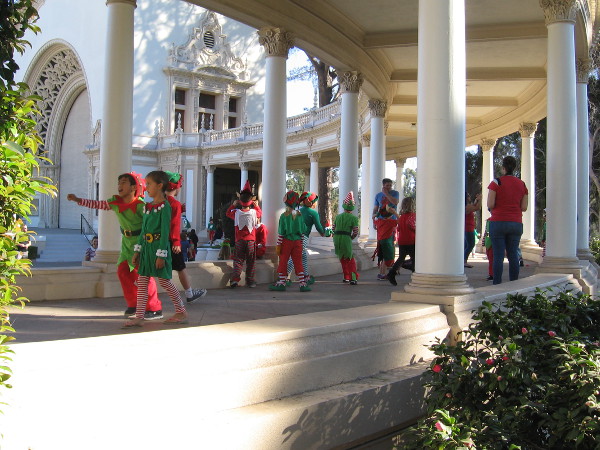 Energetic elves run about the colonnade of the Spreckels Organ Pavilion during 2017 Christmas on the Prado in Balboa Park!