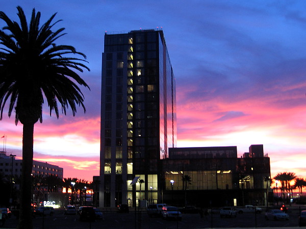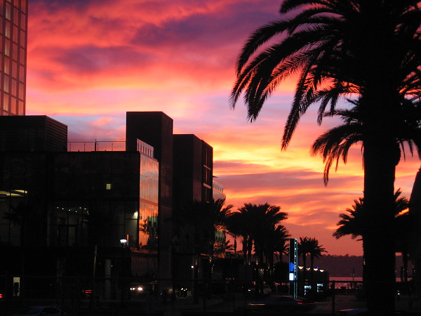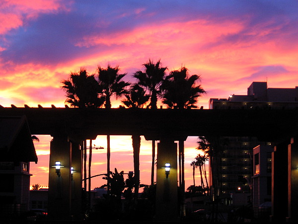 I was walking along the long train platform of San Diego’s downtown Santa Fe Depot when the clouds began to really blaze. Fantastic light reflected from the windows of nearby high-rise condos and several hotels to the west. As night fell, dramatic color crowned dark palm trees.