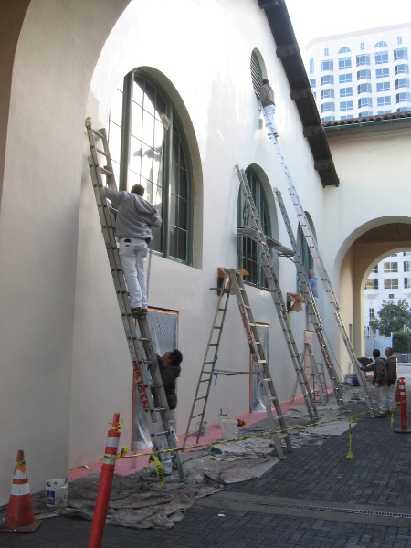 This morning, after noticing the building’s exterior is getting a new paint job, I spoke to a gentleman outside the Amtrak office and asked if he knew whether the new owner still plans to renovate the building. I was interested to hear that there are still plans for a major renovation of the building, including the opening up of an interior stairwell that will lead to a small new hotel and shops on the depot’s second floor!