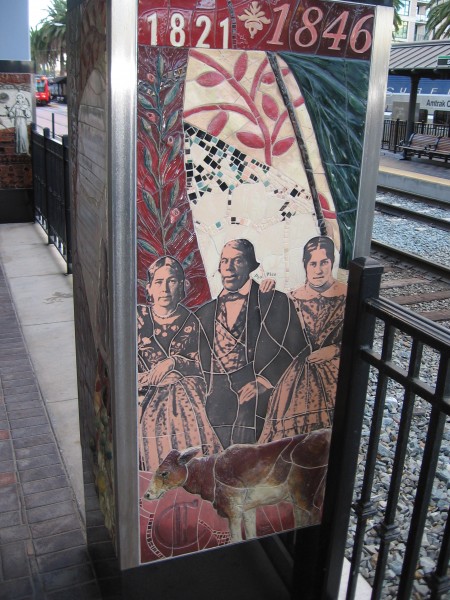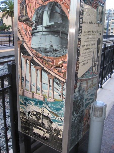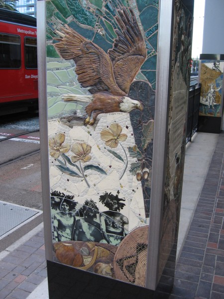Check out this cool public art! A series of beautiful, detailed scenes from San Diego history decorate ten columns just north of downtown’s Santa Fe Depot, where they can be viewed by trolley riders as they head toward Little Italy. The handmade tiles which form the exquisite sculptural mosaics were pieced together by Betsy K. Schulz in 2008. Located on the west side of downtown’s Sapphire Tower residential condominium, the artwork is titled The Tracks We Leave Behind.