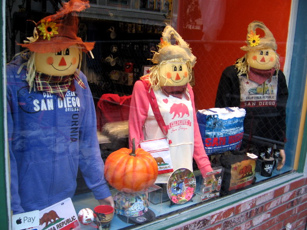 For Halloween, Hillary Clinton and Donald Trump have become skeletons in this store window. Does anyone need a costume? Trick or treat!And here we have some happy scarecrows and a pumpkin. Autumn has come to downtown San Diego!