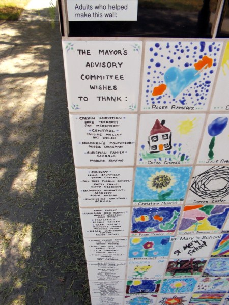 I saw this amazing tile wall in Escondido last weekend as I walked from the California Center for the Arts toward Grape Day Park. A plaque states it’s the 1994 Escondido Students’ Tile Mural. Hundreds of names from local schools appear on this happy, quilt-like mosaic.