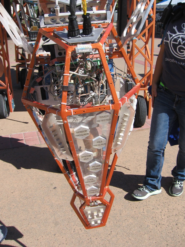 2017 Maker Faire San Diego features lots of very cool robots, including 28 foot tall Robot Resurrection.A human operator emerges from the chest of the gigantic flame-throwing robot! If this thing could walk it would be a formidable battle robot!Human and robot fingers meet.Robot Resurrection has a couple of tiny pals. Here’s one.Here’s the other!The very cool Electric Giraffe has returned to the annual Maker Faire San Diego.The Electric Giraffe can move about while using an array of sensors in its head. When the neck is raised, this crowd-pleasing robot is 17 feet tall!This cute cow robot is named Milky White. It can move its eyeballs, eyelids, ears, tail and jaws!People at San Diego’s annual Maker Faire in Balboa Park check out a very creative robot designed by a friendly young man.Many schools from around San Diego demonstrate robots and other engineering projects during Maker Faire.The Robotics Society of Southern California has a sophisticated humanoid robot that moves realistically.The Glendale Robotics Academy had their Party Rover on display in the Japanese Friendship Garden.Kids check out another robot in the garden.A performance artist becomes a fun robot. People walking down El Prado posed for photos!This robot named Darth Zamboni was created by the Top Hat Technicians of High Tech High North County. It launches balls!Small autonomous cars on a track inside the San Diego History Center. They were being controlled remotely in order to gather navigational data.Autonomous car technology being developed today utilizes deep computer learning.A student participating in the First Robotics Competition demonstrates a small vehicle that their team built. Many robots can be seen up close in the San Diego History Center.This competitive robot corrals balls and then launches them.Cool robots of every size and description are on display throughout Balboa Park during 2017 Maker Faire San Diego!