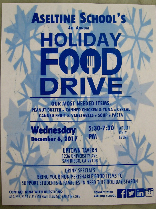 If you’re in San Diego, please consider participating in the Aseltine School’s 4th Annual Holiday Food Drive. It will be taking place on Wednesday, December 6, 2017, from 5:30 pm to 7:00 pm at the Uptown Tavern in Hillcrest, which is located at 1236 University Avenue.