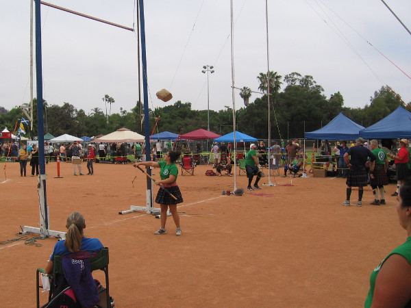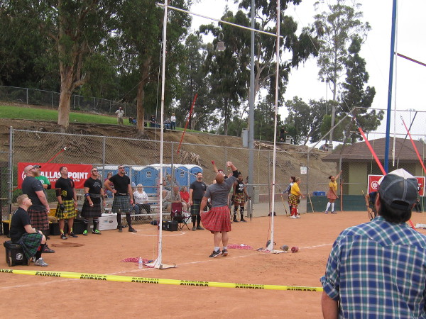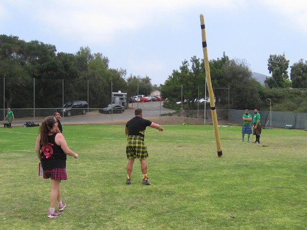 A caber goes flying. I saw one successful flip, but I don’t recall which photo shows it.