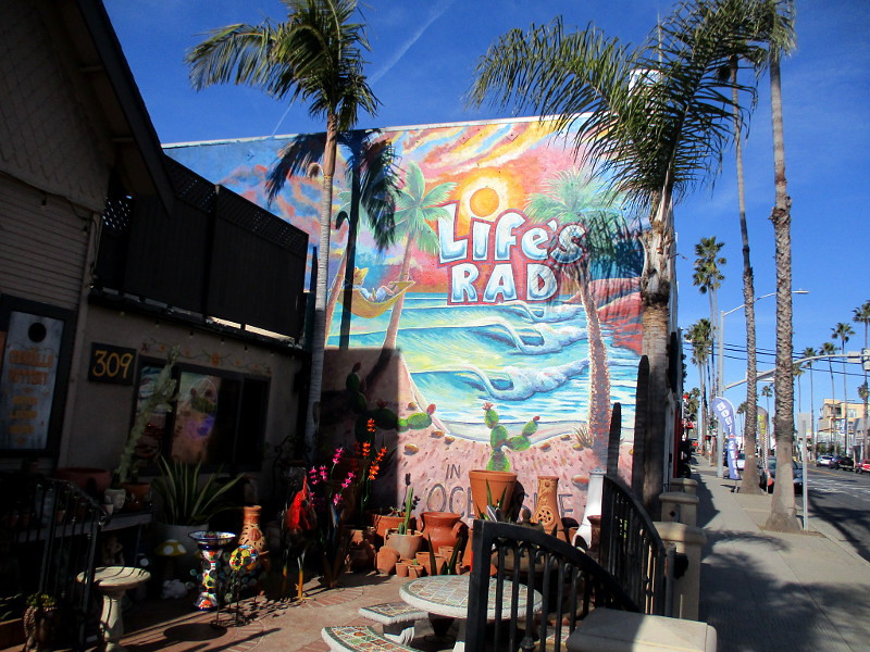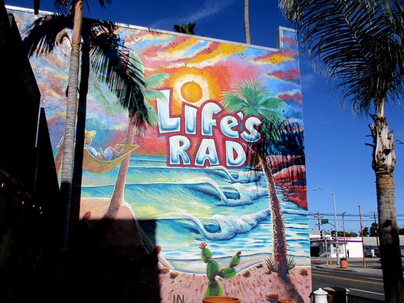 “Life’s Rad” proclaims a mural painted outside Carrillo Pottery in Oceanside. This and a mural depicting an Aztec figure drew my curiosity as I walked up South Coast Highway.