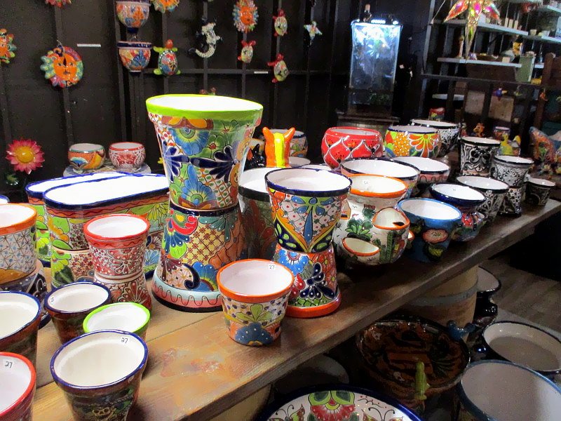 Super colorful, authentic Mexican pottery, and super unique handcrafted decor fill the large shop to overflowing. Bright colors are everywhere. The vibe inside the place is definitely SoCal.