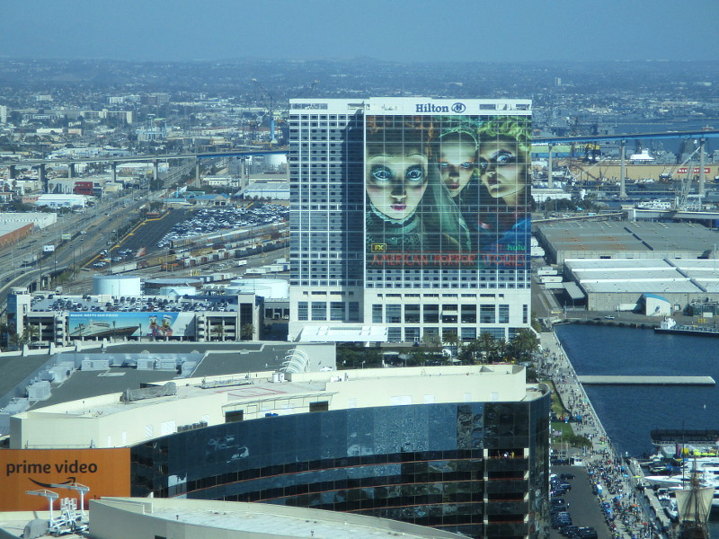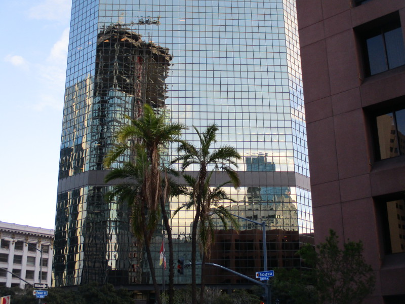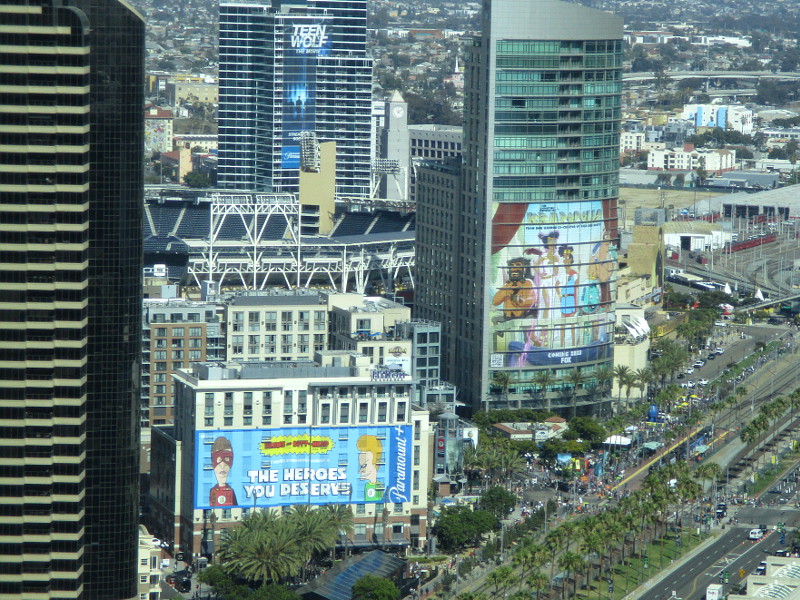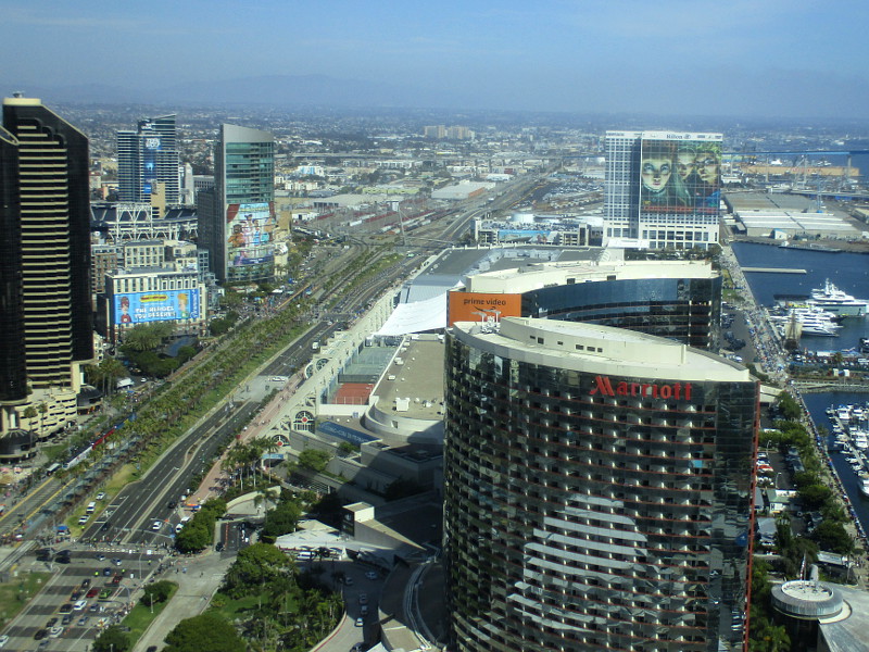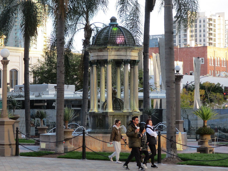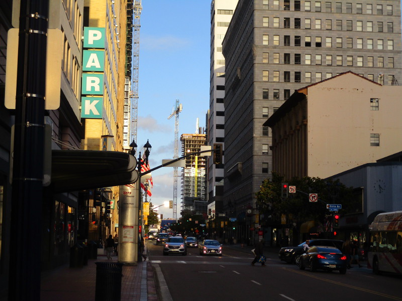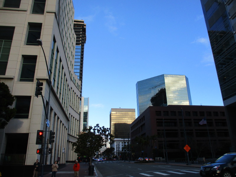 My camera and I moved slowly west down Broadway from the vicinity of Santa Fe Depot. You can see in these photos how obelisk-like America Plaza with its colorfully lit trolley station is prominent in the foreground.