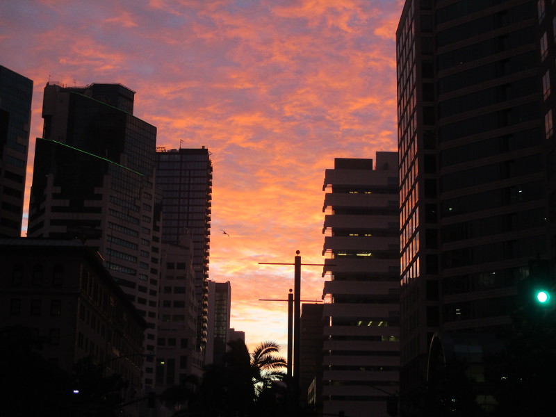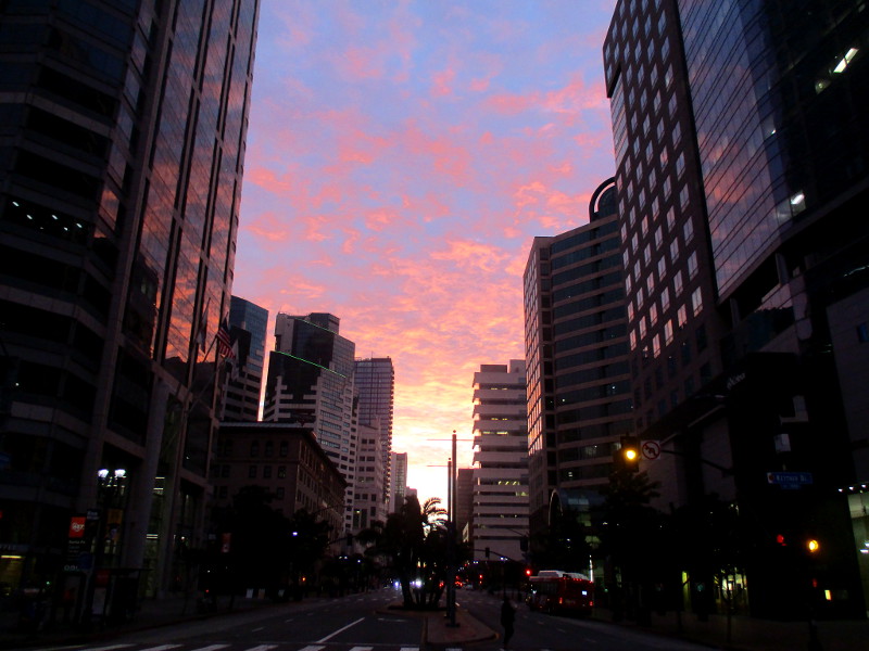 It’s early September, still summer, and the weather has been unusually warm. A bit after 6 o’clock, the sky to the east brightened and broken clouds became even more beautiful above downtown San Diego.