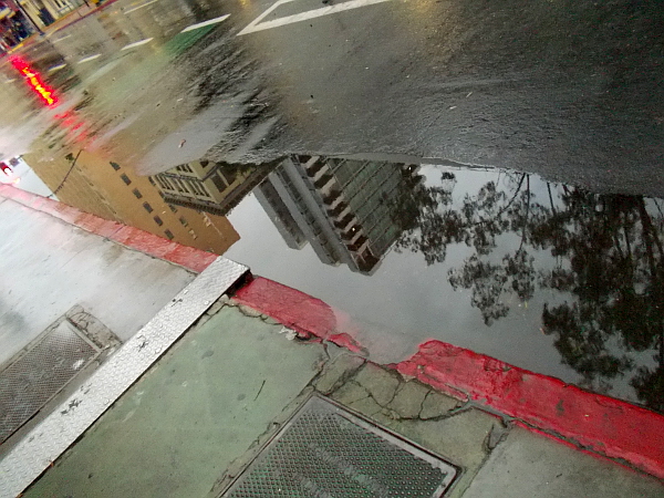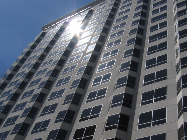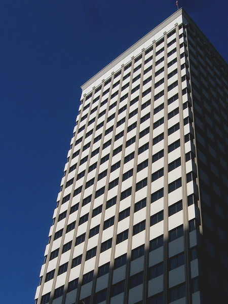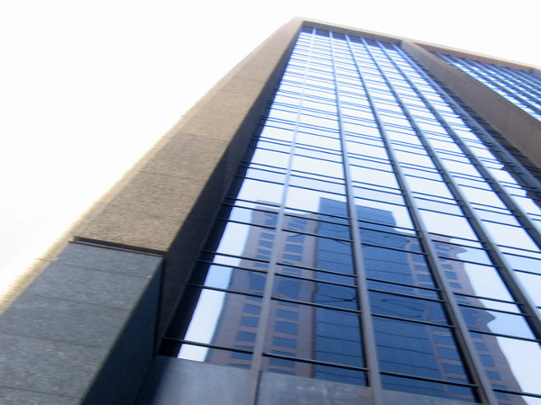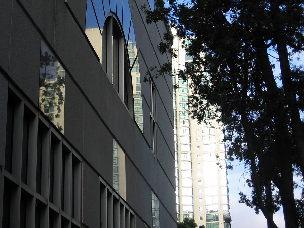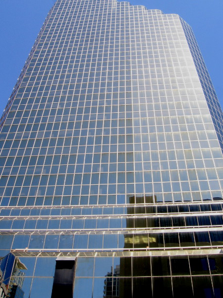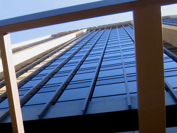 Bright reflection, shadow, and the grid-like windows of tall buildings produce strangely appealing patterns. The photographs that result can make what is familiar mysterious.
