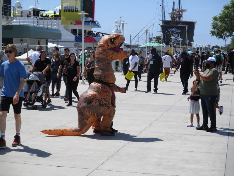 Captain Kirk has beamed down to the Starfleet Outpost.A street performer flies through the air. No cape required!They’re not vampires, I learned. They are dark wizards. I got my copy of Forgotten Runes.Better watch your back.Hello nice FX person! Over an hour wait? I’ll try again later.The Rookie has his eyes on the Friday Comic-Con crowd.Does one play Dodgeball with a mini beach ball? Well, it is San Diego!Uh, there’s a Tyrannosaurus rex running loose out here.Cool lucha libre guy. When’s the next match?Crunchyroll graphics at the Rady Shell box office.I hear electronic dance music. What’s going on over here?A rehearsal for the Crunchyroll dance party appeared to be underway.A Deadpool food truck!A cool guy demonstrates a droid that he made, in the lobby of the Manchester Grand Hyatt!Awesome Demon Slayer car wrap!This karate kid is the winner!You can’t possibly have too much fun at Comic-Con!