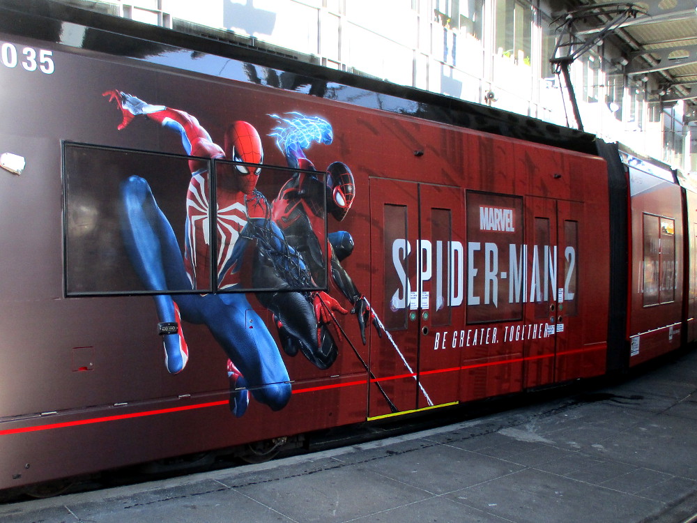 A very cool new trolley wrap that will run during Comic-Con 2023 promotes the upcoming Spider-Man 2 action-adventure video game, which will be available on PlayStation 5.