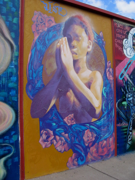 Right panel of awesome North Park mural contains the word Esperanza, which is Spanish for Hope.Another section of this cool public artwork depicts a large red rose, among buildings and interesting patterns. Created by Kreashun.Spray paint art by San Diego artist Maxx Moses. A character composed of many diverse elements, beneath the words Place Labels on Us From Childbirth.A beautiful figure seems to pray in a wreath of roses.A childlike blue face and long, colorful wavy hair, created by Gloria “GLOW” Muriel.This street art is on the same building. It reads Reality is Wrong. Dreams Are For Real. Hooligan Arts.Cool street art at 30th and Gunn, part of the North Park Mural Project.