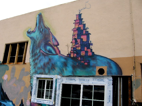 Houses appear to be stacked on the back of a howling wolf! One of several fantastic images on a building that is being renovated in North Park.