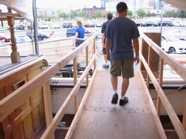 The poop deck has been beautifully refurbished, using modern materials and construction methods.One side of the Star of India’s main deck now appears as it did when the ship was brand new, 153 years ago!A temporary bridge was erected so that visitors boarding the historic tall ship could cross the port side where deck reconstruction is underway.Crossing a temporary bridge above the main deck of the Star of India, the world’s oldest active sailing ship!