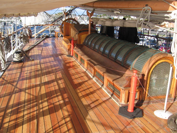 The beautiful new wood deck underfoot is meant to last another 50 or so years. The bench along the saloon’s skylight will be sanded and varnished next.The 1863 Star of India is a world treasure. Its amazing, varied history includes circumnavigating the globe 21 times. It’s the oldest active sailing ship in the world!A visitor rang the ship’s cheerful bell while his friends talked near the binnacle and helm.The helm’s new varnish is still drying! In my dreams I command this amazing tall ship while standing at the wheel!A super nice Maritime Museum docent showed me how the steering mechanism works. The two opposing screw-like worms were made with amazing precision over 150 years ago!The port side of the main deck has been caulked! Now just to sand and apply several layers of sealing protection.The people at the Maritime Museum of San Diego are working hard to keep an important part of world history alive.The finished main deck on the starboard side. Soon the entire ship’s deck will be shiny like new!Folks enjoy a sunny San Diego day on the newly restored poop deck of the historic tall ship Star of India.