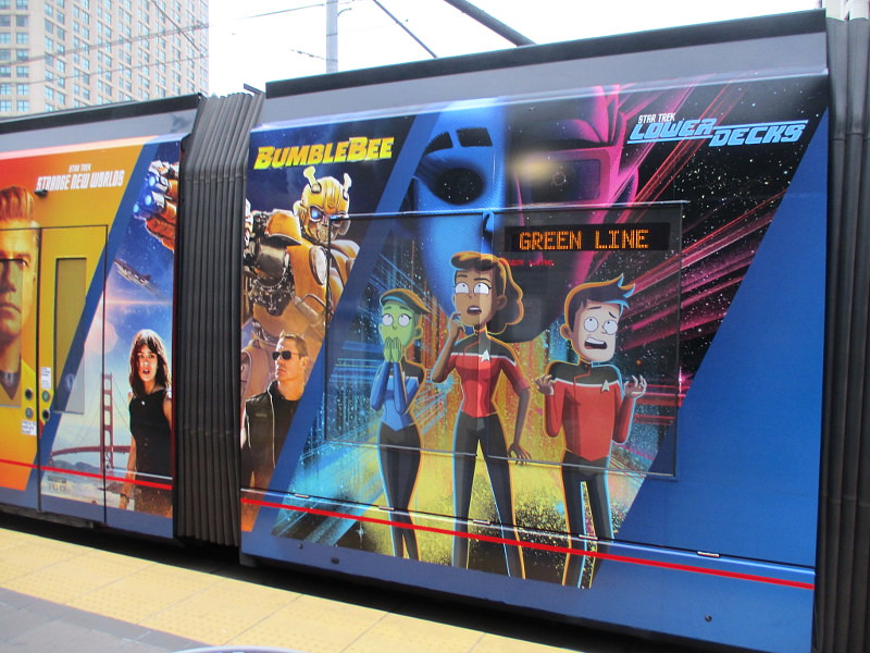 The new trolley wrap that I discovered today features many more shows available on Paramount+. Graphics on one side promote iCarly, Yellowjackets, School Spirits, Dungeons & Dragons: Honor Among Thieves, and 1923. The other side includes Star Trek: Lower Decks, Bumblebee, Star Trek: Strange New Worlds, Evil, and Tulsa King.