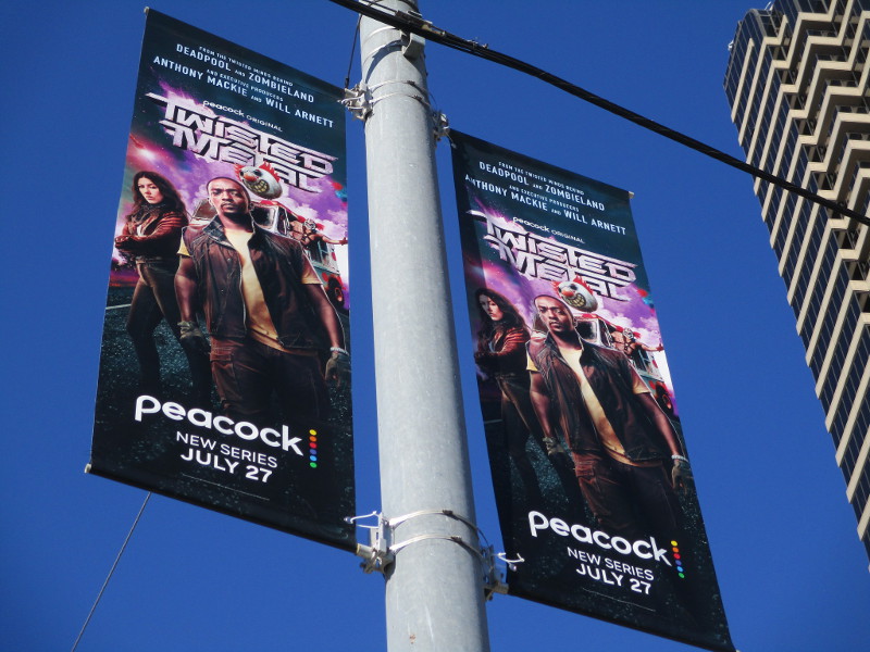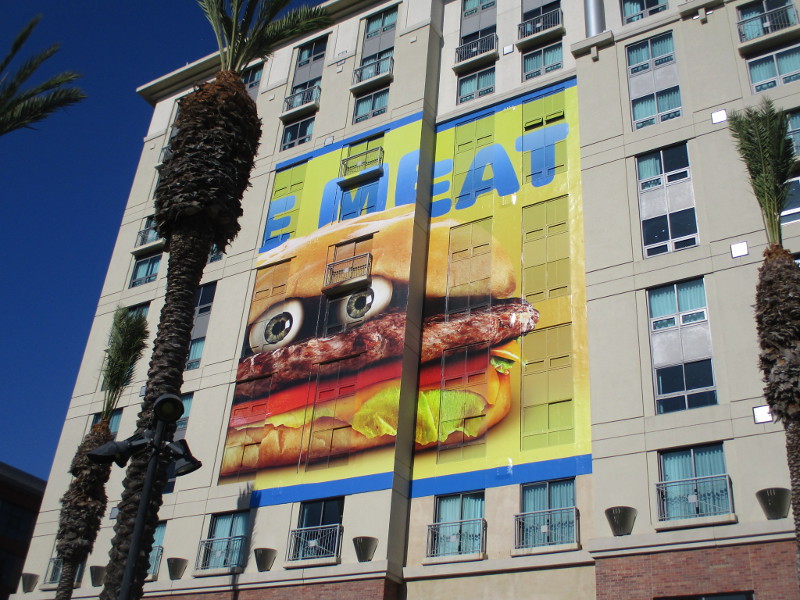 Twisted Metal banners line Martin Luther King Jr. Promenade.A meaty wrap on one side of the Hilton Gaslamp.The big Fox Animation Domination wrap on the Omni appears over half finished.The stylish Interview With The Vampire graphics on the Hilton Gaslamp are among my favorites.