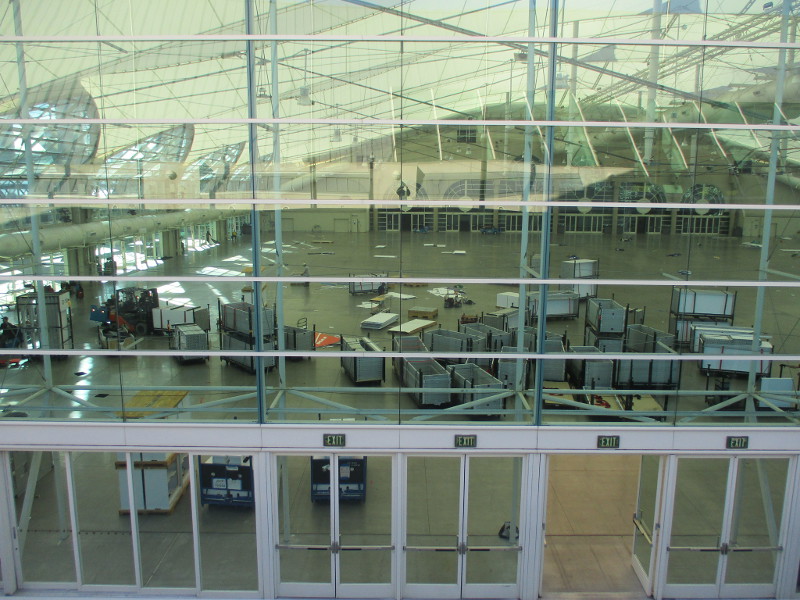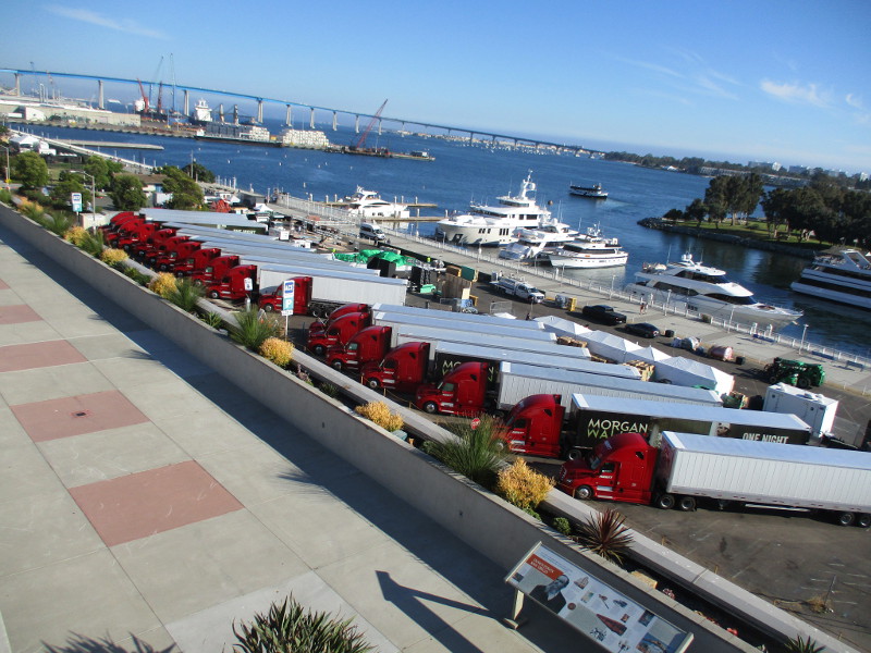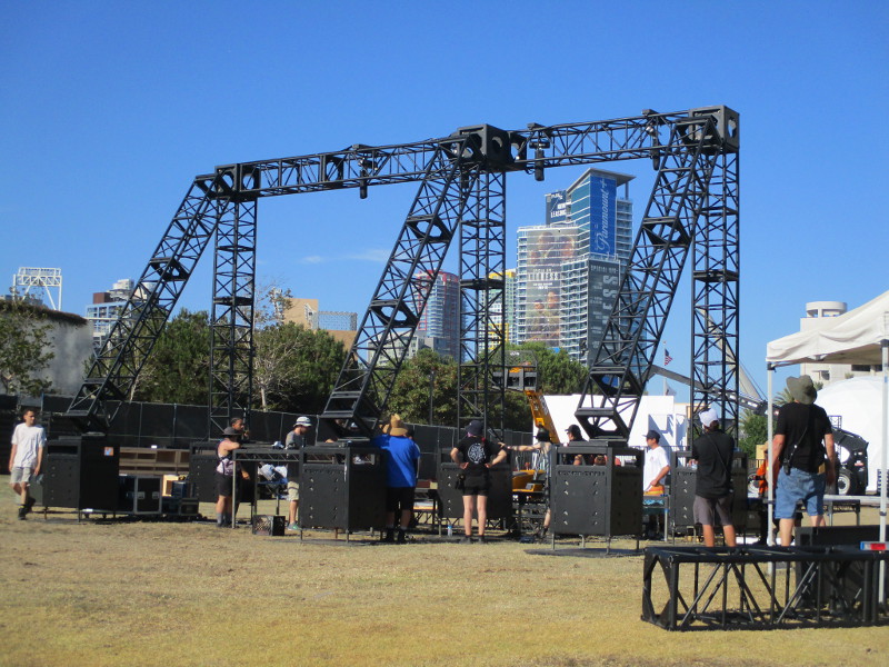 Look at all the trucks behind the San Diego Convention Center. They’re here for the big Morgan Wallen concerts at nearby Petco Park.Getting things ready under the sails of the convention center.