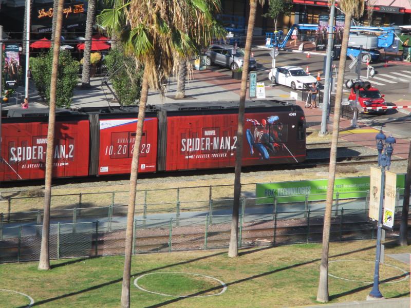 Jack in the Box has a trolley wrap featuring Jack fan art, it appears! I spotted these faces in the trolley yard from the Harbor Drive pedestrian bridge…