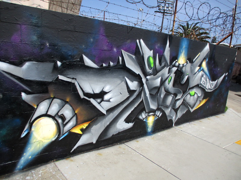 The building at 2905 Commercial Street in San Diego was recently spray painted with a huge, very cool mural by graffiti artist Qvo (@qvo_one). The graphics depict various space ships and Yoda from Star Wars using The Force!