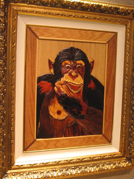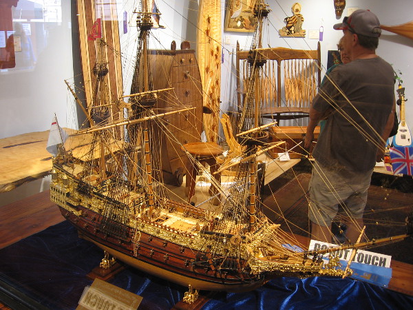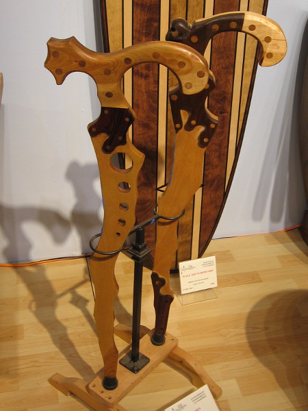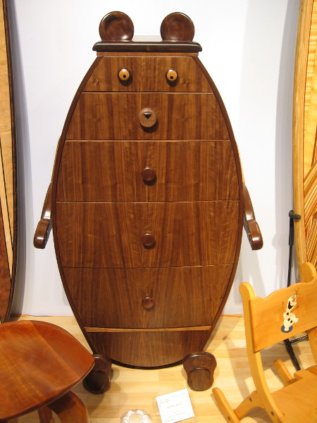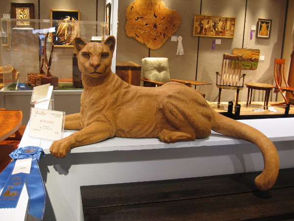 Glass table supported by fantastic underwater character carved from wood. Califa’s Realm, Avocado, Lorenzo Foncerrada.A steampunk writer might enjoy creating new worlds while sitting here! Time Machine Desk, Recycled Pine and Plywood, Jeffrey Comulada.Yikes! Get out of the way! This eye-catching contraption is just too cool. Scorpion Wheelchair, Pine, Roger Aceve.A truly amazing fantasy woodcarving. Julia the Dragon Killer, Bass, Antonio Barrios.Ancient warrior and an incredibly elaborate helmet made of wood. Dracon Soldier, Bass, Antonio Barrios.More outstanding artistry. Heron in a scene from a San Diego lagoon. Spirit of San Elijo, Torrey Pine, Lorenzo Foncerrada.Wood grains flow in this crazy organic bench. Ongoing Conversation, Baltic Birch, Alan Johnson.A very cool tangle-tentacled wooden octopus. Denizen of the Deep, Maple, Tom Edwards.Perhaps this is a wood version of Strider from Lord of the Rings. Ranger, Basswood, Randy Stoner.A mountain lion carved from wood keeps guard among other spectacular works of art. Kitty Kitty, Mahogany, Bill Churchill.This skeleton pirate with a brass steampunk telescope is beyond awesome. Mutiny, Bloodwood Fir, Mike Anderson.Two very cool handmade guitars with an Alice in Wonderland theme. I see clocks, the White Rabbit, a mad tea party, even a mustache!I love this example of imaginative wood design. Jack Rabbit, Alder, Ray Camien.Members of the San Diego Scrollsaw Clubs demonstrate their craft to people visiting the Design in Wood Exhibition at the San Diego County Fair.A wonderfully inventive piece of furniture. Birdcage Chair, White Oak, Patrick Atangan.Looks like an animal skull in the desert Southwest. Early, Early American Chair, Poplar, Del Cover.This might be the most intricate model tall ship I ever saw. Sovereign of the Seas, Boxwood, Mahogany, Ebony, Sycamore, William Norris.When a person becomes old, there’s no need to become dull. Two Canes, Various, Tracy Talbott.A fun chest of drawers perfect for a kid’s room. Buddy Bear, Walnut, Ralph Crowther.I wonder if Lewis Carroll imagined there would be steampunk powerboats one day. Looking For Alice, Various, Michael Rumsey.I love the cosmic layered wood sky with Saturn behind buildings. Night Surfing, Hardwood Plywood, Robert Stafford.Gears aplenty. Steampunk Cat, Various, Stephen Knight.Now this work of wood art totally blew my mind. Absolutely beautiful. Stormy, Various, Chuck Collins.Yeah, some days this pensive chimp could easily outwit me. Thinking, Various, Daryoush Ababaf.