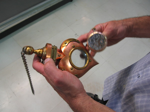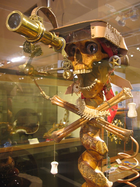 The museum floor is filled with every sort of cool steampunk and unusual, retro-looking vehicle you might imagine!The Cyclops, a steampunk trike with a 3-cylinder Triumph Daytona engine, by artists Baron Margo and Jaime Martinez.Time Machine, by artist Richard P. Ingalls. This was commissioned in 2014 by the Salk Institute of Biological Studies for its annual staff service awards program!Assemblage artist Dan Jones created this cool little robot sculpture. He exhibits his work at San Diego Comic-Con, as well as many galleries, steampunk and sci-fi conventions.Another cool work of art by Dan Jones.Artist Ken Whitney created these body-like Hardware Sculptures out of metal washers, gears and other similar material.Jeff Steorts poses for a photo. Some of his symbolic objects are clocks or resemble them. He explores many themes, including Time and Space.Jeff shows me some of his fantastic art.Many of Jeff’s creations resemble lockets, or golden hearts with keys. Others resemble shining boxes or religious relics.One of the many super cool vehicles you’ll see when you visit the San Diego Automotive Museum during Steampunk: The Exhibit.I failed to note what this is exactly. But it’s definitely awesome!Loki, a custom 1981 Harley Davidson Ironhead Sportster, by metal artisan Marko Djoric.1929 Dodge Brothers Copper Rat, by Jeff Jones. This amazing car has been on the cover of Ol’ Skool Rods.The car’s interior is all hand-built copper and aluminum. 10,000 rivets were hammered into place!The Rocket Roadster, a driveway build by Baron Margo.The Metamorphosis, a Moderne Nautilus co-created by Baron Margo and Jaime Martinez. A Jules Verne inspired cross between an airplane and submarine!