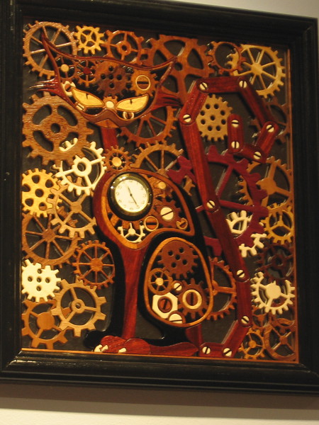 The Alice in Wonderland theme intersects with Steampunk, of course, so many fantastic contraptions and quirky bits of wood art are included in the exhibition. Take a look!