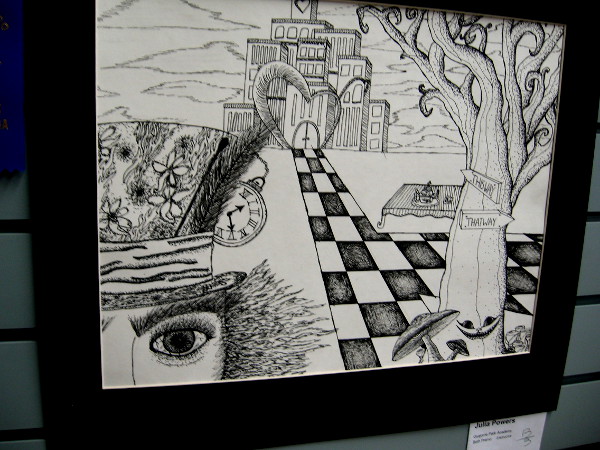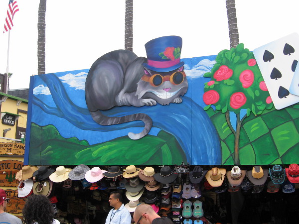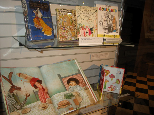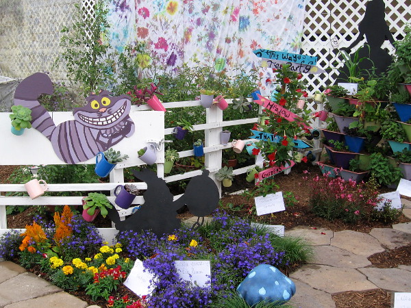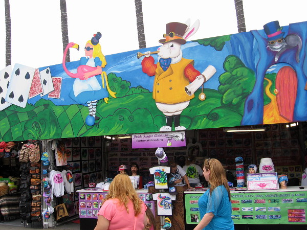 Walking down the good old midway. Once known as the Del Mar Fair, the county fair is a wildly popular summer attraction in Southern California.There’s a White Rabbit walking along! Don’t follow him! You don’t know where he might lead!Alice falls down the rabbit hole. One of many outstanding works of art by high school students displayed at the San Diego County Fair.A high school pencil drawing of an imaginative Wonderland.A first place winner at the San Diego County Fair. This student created a very nice visual composition.More fantastic art. Alice tries to make her way through endless weirdness and absurdity.One of many fun displays outside at the Paul Ecke Jr. Garden Show. I see the grinning Cheshire Cat and all sorts of other Alice in Wonderland stuff.Some steampunk contraptions at the outdoor garden show. I see a cool steampunk washing machine and a weird metal Mad Hatter taking a shower.Another fun entry at the garden show. These gardens seem to contain many teacups and mushrooms.Flowers, butterflies and trees shaped like hearts, diamonds, spades and clubs.The Queen of Hearts wants people to have their photo taken here. Or it’s off with their heads, I suppose.It’s Tweedledum and Tweedledee. They’re from the sequel to Lewis Carroll’s Alice’s Adventures in Wonderland, the equally classic Through the Looking-Glass.Some more fun Alice in Wonderland pottery characters created by The Madd Potter.A long colorful mural above some fair vendors depicts beloved characters created by Lewis Carroll. Their appearance has evolved due to popular culture and now incorporate steampunk elements like goggles.Alice plays flamingo croquet in a fantasy world full of rampant irrationality and nonsense.Even the Cheshire Cat has gone steampunk!Get ready to enter the Mad About the Fair exhibit. It’s dark inside, so many photos didn’t turn out so good.I’ve spotted Alice! She’s passing a huge hat possibly worn by The Hatter. He must have one huge head.One display highlights differently illustrated Alice’s Adventures in Wonderland books over the years. Some are imaginative adaptations or interpretations.A super long table in the exhibit was set for an epic tea party!A whole variety of displays paid homage to the Steampunk genre. Here are some Victorian ladies in cool steampunk top hats.A very cool steampunk mechanical man made of brass gears, with a glass globe for its head.Clocks seem to be a common Wonderland motif. All sorts of fun old clocks were displayed on this wall. I didn’t see the White Rabbit’s pocket watch.The cool artwork of singing legend Grace Slick was on display! You might remember the Jefferson Airplane smash hit White Rabbit.The White Rabbit represents curiosity–always in a hurry and just out of reach. He is a moving mystery.Alice awaits at the 2016 San Diego County Fair. Follow her back down into the rabbit hole, if you dare!