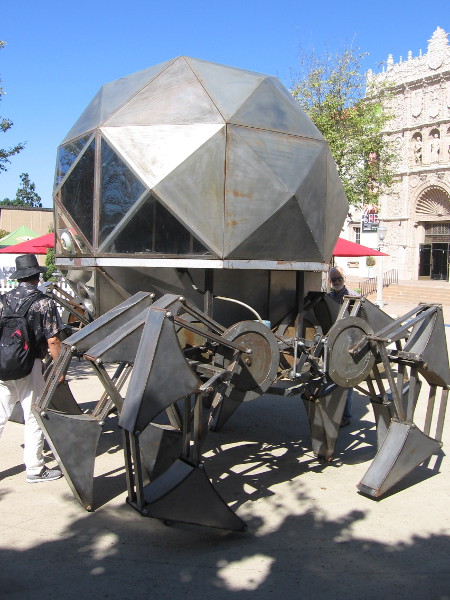 A huge spider-like working octopod vehicle on display in the Plaza de Panama at 2016 Maker Faire San Diego!