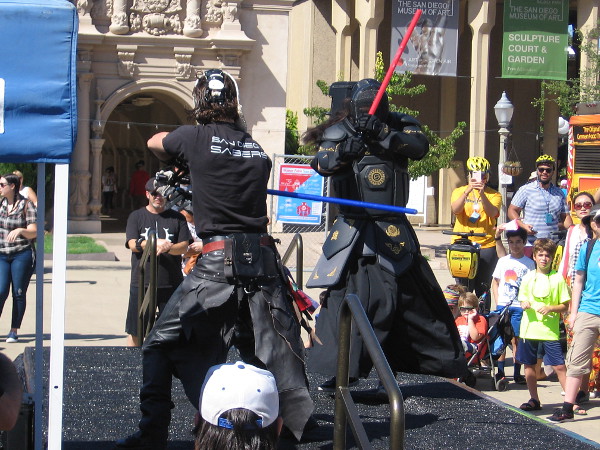Maker Faire San Diego has taken over Balboa Park this weekend. The annual event features fantastic creations and the inspired creators who like building cool stuff!This super cool octopod moves slowly forward and backward using its spider-like feet. I’d love to sit inside and drive it! I learned that it doesn’t steer very well, however.In the morning, before the Maker Faire officially opened, I spotted two cupcake cars heading through Balboa Park!This guy was flying what appeared to be a huge model of a Star Wars Imperial Star Destroyer down Balboa Park’s El Prado!A bunch of Maker Faire exhibitors set up on Saturday morning in front of the San Diego Air and Space Museum in Balboa Park.This human powered submarine was created by a team of students at UCSD. It competed in the International Submarine Race and was propelled by a 3-D printed fin.This cool robot was created by high school students, namely High Tech High’s Top Hat Technicians. It competed in an event where a ball had to be shot at a goal.Make your own molecule using this cardboard Molecube!These awesome guitars were made by students in a special STEM Guitar-Building class at San Diego City College.The Ghostbusters ECTO-1 vehicle has arrived for Maker Faire San Diego, as well as a Jeep from Jurassic Park.Commissioner Gordon must be nearby. I spotted his Gotham Police Department vehicle.A tiny house would be built here during the Maker Faire weekend. When I first walked by, the floor was being laid down.About an hour later, one wall was already up!The Electric Giraffe returned for 2016 Maker Faire San Diego. It walks, talks, and has become quite a phenomenon. It has even appeared at the White House!The Electric Giraffe is 17 feet tall when its neck is fully raised. Its “horns” (actually ossicones) appear to be lava lamps!These creators at Maker Faire San Diego were building the Temple for Youtopia. It’s an interlocking plywood parabaloid with a single light source at it’s focal point. When finished, light shines out everywhere.A similar Temple is built each year at Burning Man and set on fire.I noticed a lot of cool Star Wars cosplay at 2016 Maker Faire San Diego.I caught this Star Wars cosplay between Balboa Park’s House of Hospitality and the Japanese Friendship Garden.Back in Balboa Park’s central Plaza de Panama, the San Diego Sabers engaged in a fast-paced lightsaber battle!Enthusiasts in cool protective costumes engage in lightsaber combat as a crowd watches during 2016 Maker Faire San Diego!Anybody passing by was invited to Paint a Prius near the San Diego Automotive Museum!Kids have a blast in front of the San Diego Air and Space Museum. Air-propelled rockets were flying all over the place.Kids at Maker Faire San Diego test a carbon dioxide cannon, made from a garbage can!This remote control robot batter was swinging wildly at beach balls. A rather amusing scene! (Wish I’d taken a better photo.)Here comes AR-Duo, the Caloric Rover, a cool steampunk rolling doohickey which is beyond awesome.There’s just too much fun at 2016 Maker Faire San Diego! Head over to Balboa Park this weekend!