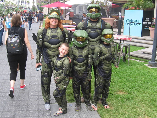 Sora cosplay from Kingdom Hearts.A steampunk cosplay.Loki and Thor cosplay. That weapon looks like the one Thor used on Sakaar fighting Hulk.Cosplay of Demon Worker from Your Pretty Face is Going to Hell.Batman grins. I’m not sure about the cosplay next to him.The Avengers’ quinjet must be out of action. Here come Spiderman, Captain America and Black Widow on scooters!Cosplay of Haru from The Cat Returns.A disco Darth Vader with flashy clothes and an Afro.I was told this is Super Fan!Cosplay of Kevin from Up!Harley Quinn got off her scooter for a photo!Halo cosplay by a happy family at Comic-Con!Halo family poses with a Star Wars stormtrooper.I hope Bane realizes the Grim Reaper is nearby. I don’t believe the drug Venom makes him immortal.Here’s another Harley!Cosplay of Petyr “Littlefinger” Baelish from Game of Thrones.Captain America and Wolverine cosplay.These might be garden gnomes, but I really don’t know. UPDATE! I learned they are, indeed, garden gnomes!Captain Jean-Luc Picard cosplay. Ready to take the photo? Make it so.It’s another Harley! I think this one is teasing me! I hope Joker doesn’t find out.Cosplay of Negan of The Walking Dead.I don’t recognize this cosplay. UPDATE! It finally occurred to me. It’s a Harry Potter Death Eater! I believe that’s the mask of Lucius Malfoy.Cosplays of Gamzee Makara and Nepeta Leijon from Homestuck.Umbrella Corporation cosplay from Resident Evil.Boba Fett cosplay.Yikes! Looks like these guys were caught in another Sharknado.Judge Dredd and Judge Death cosplay.