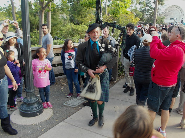 Bagpipe player attracts attention of visitors to San Diego’s beautiful Balboa Park.
