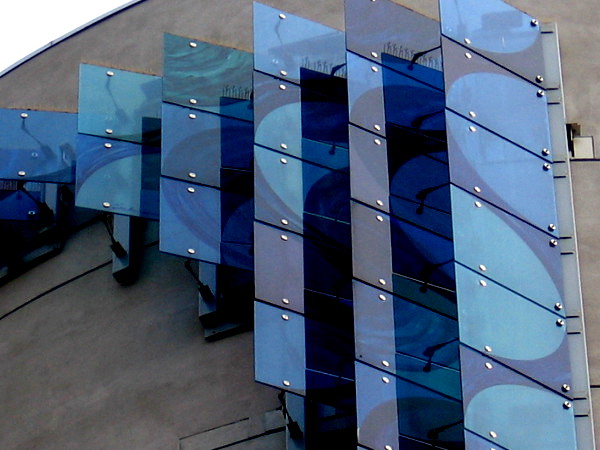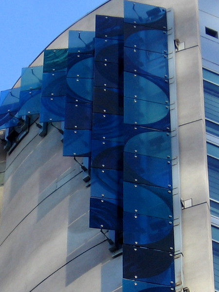 The photographs you see here were taken on a couple different days. The blue glass panels are most brilliant on cloudless days in the early afternoon, right around two o’clock.