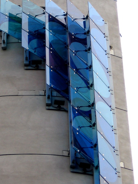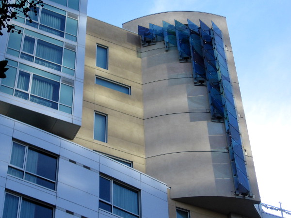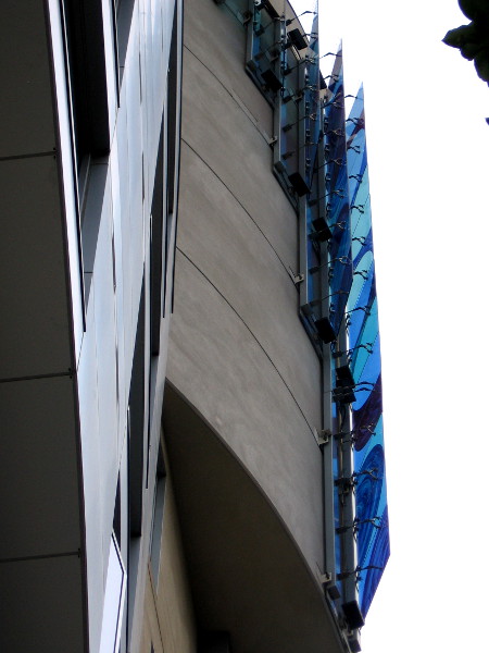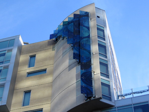 Indigo Waters is a 40-foot blue glass panel sculpture mounted near the roof of the Hotel Indigo San Diego Gaslamp Quarter. This very cool public artwork was designed and created for the hotel about ten years ago by local artist Lisa Schirmer. You’ve already seen her work on this blog, in the form of vibrant baseball windglyphs now flying at Lane Field Park!
