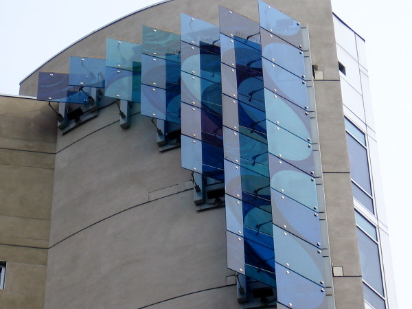 Lisa Schirmer’s sculpture really takes life in San Diego’s sunshine. As the sunlight changes, Indigo Waters seems to ebb and flow. Light passing through and reflecting from the 33 hand-painted glass panels produces a variety of magical effects.