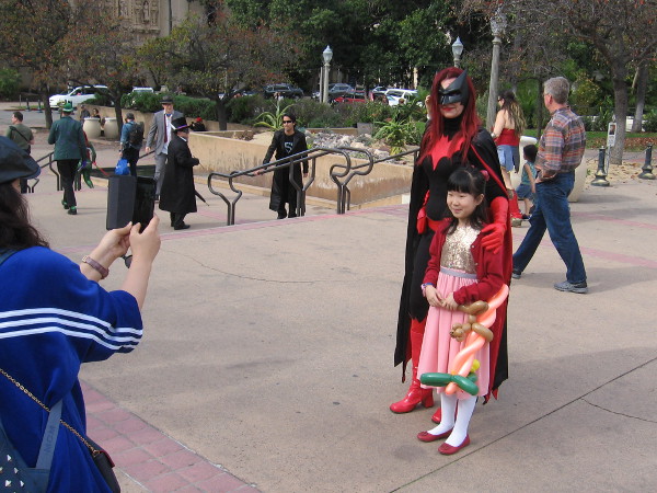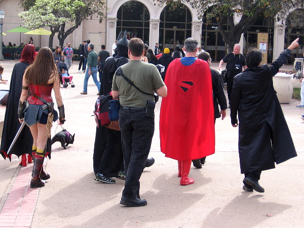Another typical San Diego afternoon. Super powered folk amble casually into Plaza de Panama. The Justice League patrol of Balboa Park has been a resounding success.