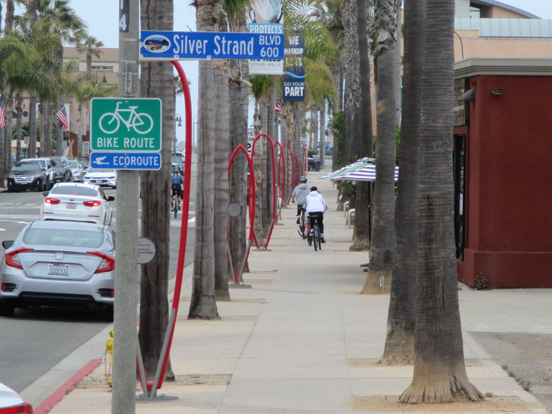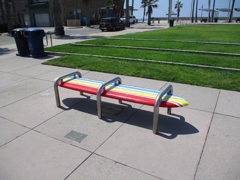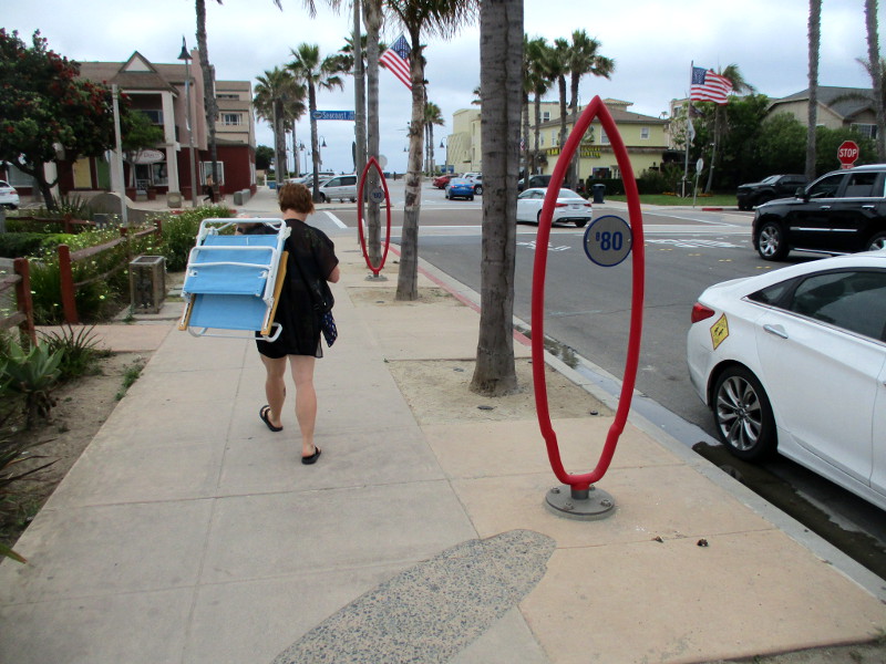 A short distance from the beach, on either side of Palm Avenue from 3rd Street to Seacoast Drive, 25 different historic surfboard designs are displayed as life-size red metal sculptures, whose shapes cast sandblasted “shadows” across the sidewalk.