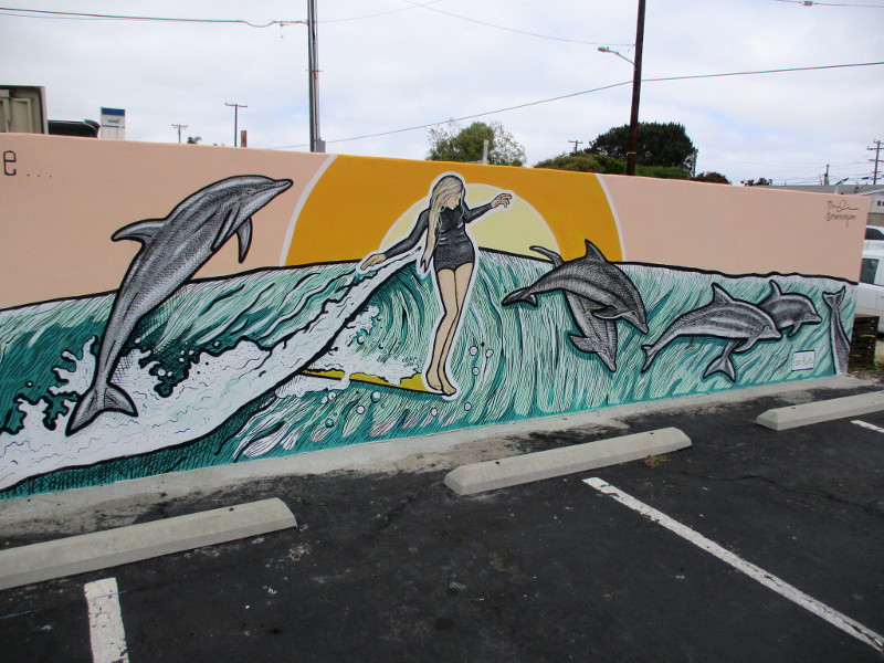 Back in 2015, a mural depicting two surfers and sea birds was painted on both sides of a gas station wall at the entrance to Ocean Beach. You can see it as you drive into OB, at the corner of Sunset Cliffs Boulevard and West Point Loma Boulevard. The eye-catching mural was painted by Southern California artist Henry Goods.