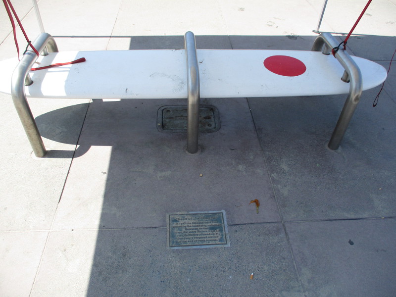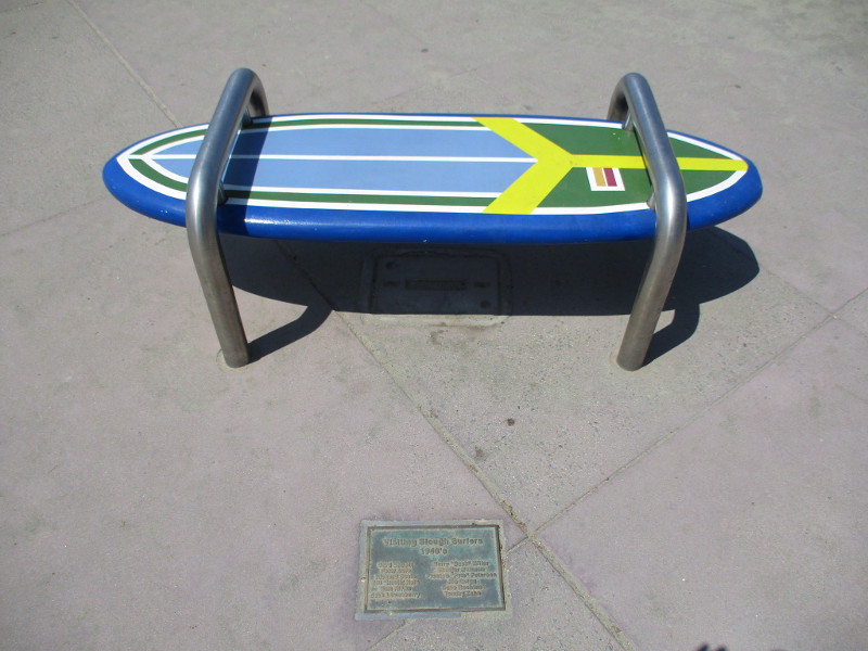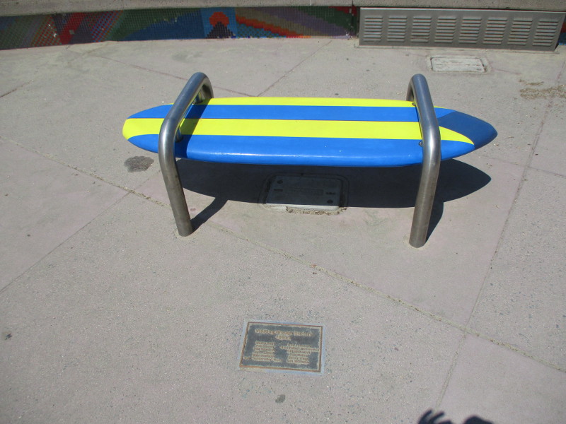 If you walk around Portwood Pier Plaza at the foot of the IB Pier, you’ll see a bunch of colorful surfboard benches where you can rest and gaze out across the beach. Look down and you’ll discover plaques next to each bench.