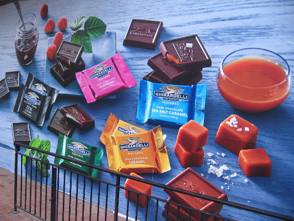 A graphic on a construction fence designed to make people drool! All these Ghirardelli treats and more will be returning to the Gaslamp!