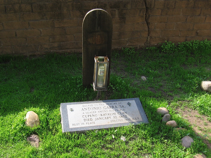Garra was blamed for the murder of four people at Colonel Warner’s Rancho on November 22, 1850, and he was sentenced to be executed. On January 12, 1852, he was brought to the El Campo Santo cemetery in Old Town and told to kneel down beside a ready grave in front of a firing squad. He last words were: “Gentlemen, I ask your pardon for all my offenses and expect yours in return.”