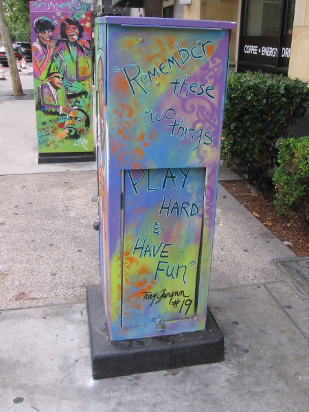 I spotted this amazing electrical box today while walking near the intersection of Park Boulevard and Market Street in East Village. It stands near another box painted with legendary musicians. I shared those photographs in my previous blog post.