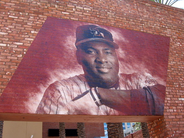 The face of Dave Winfield, a past San Diego Padres superstar, now in the National Baseball Hall of Fame, greets fans on the north side of Petco Park’s historic Western Metal Supply Co. building.