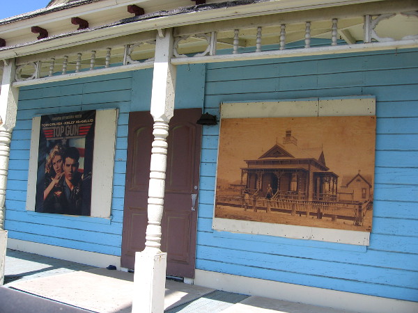 On the front of the house is a classic Top Gun poster and a vintage photo of the house as it once looked, long ago.
