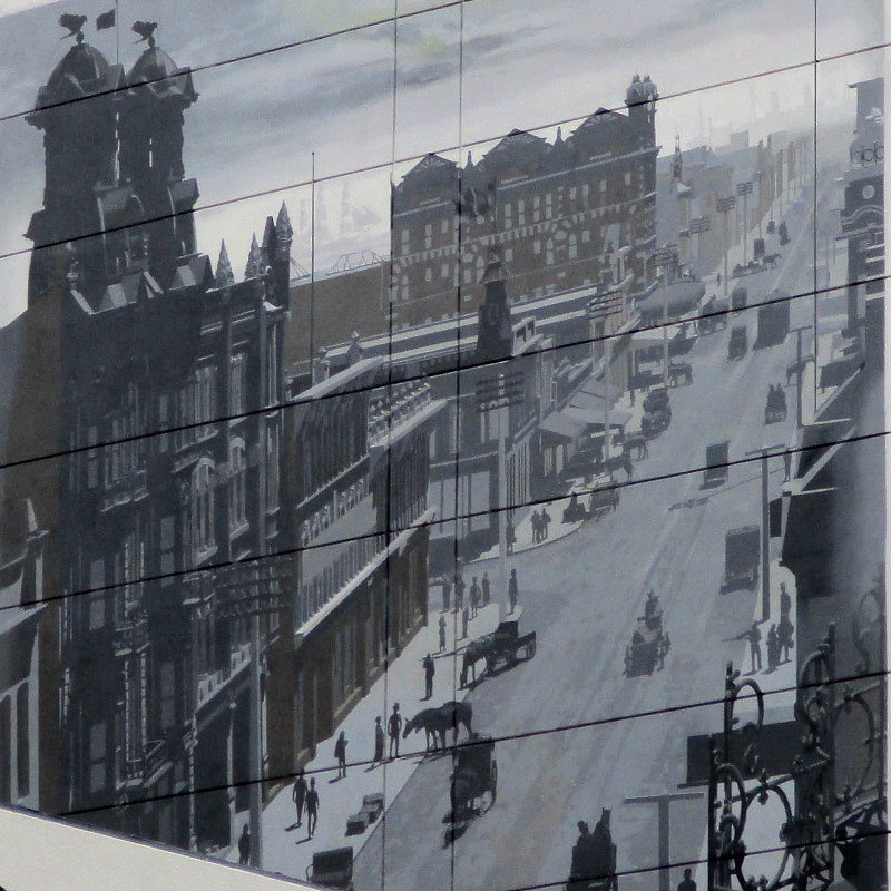 The tall building depicted on the left side of the mural is the Louis Bank of Commerce Building, which in the late 1800’s became home to the Oyster Bar, one of four saloons and gambling halls operated by Wyatt Earp when he lived in San Diego